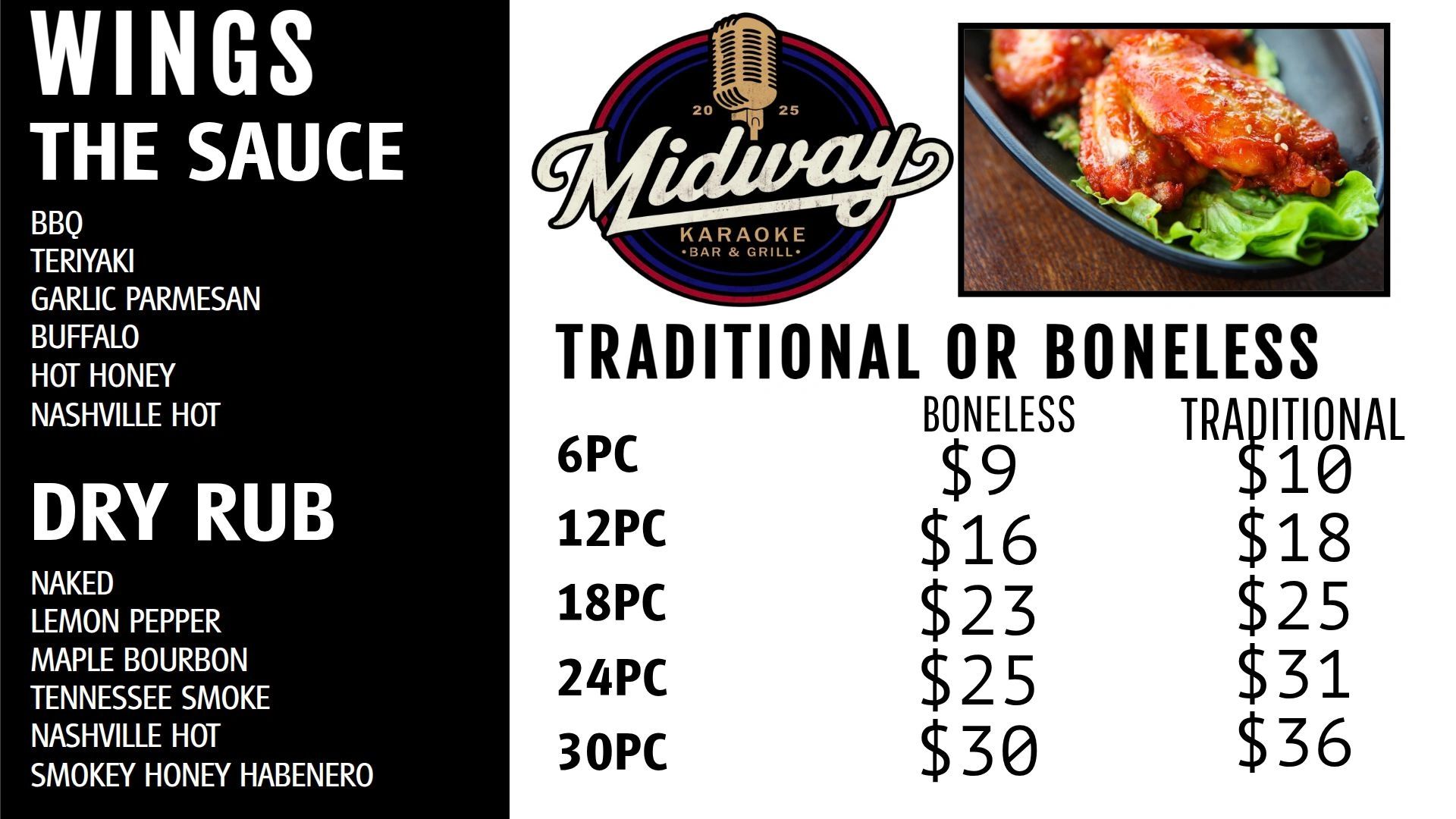 We have all the flavor of wings you could possibly want! Don't see a flavor you want, let us know and we will get it added to the line up!